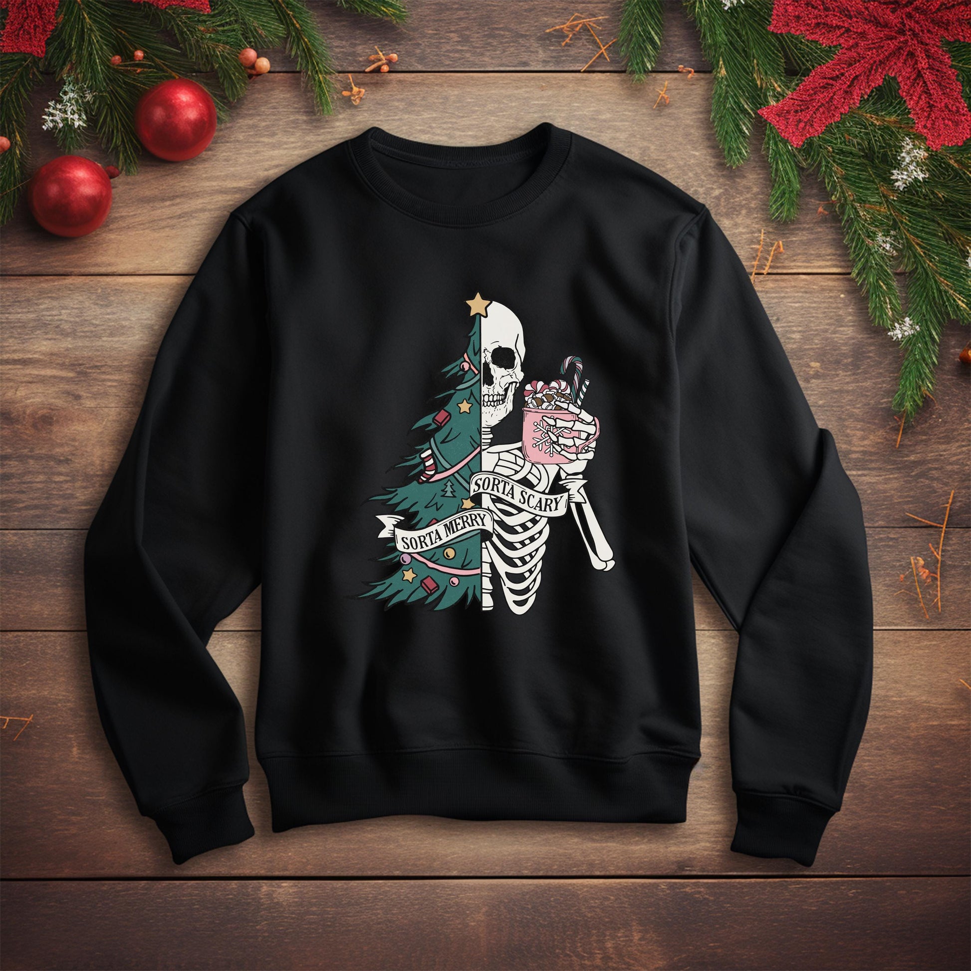 Embrace the dual spirit of the holiday season with our unique Sorta Merry, Sorta Scary Christmas Crew Neck Sweater. This festive yet edgy black sweater features a captivating design that perfectly balances holiday cheer with a touch of spookiness.